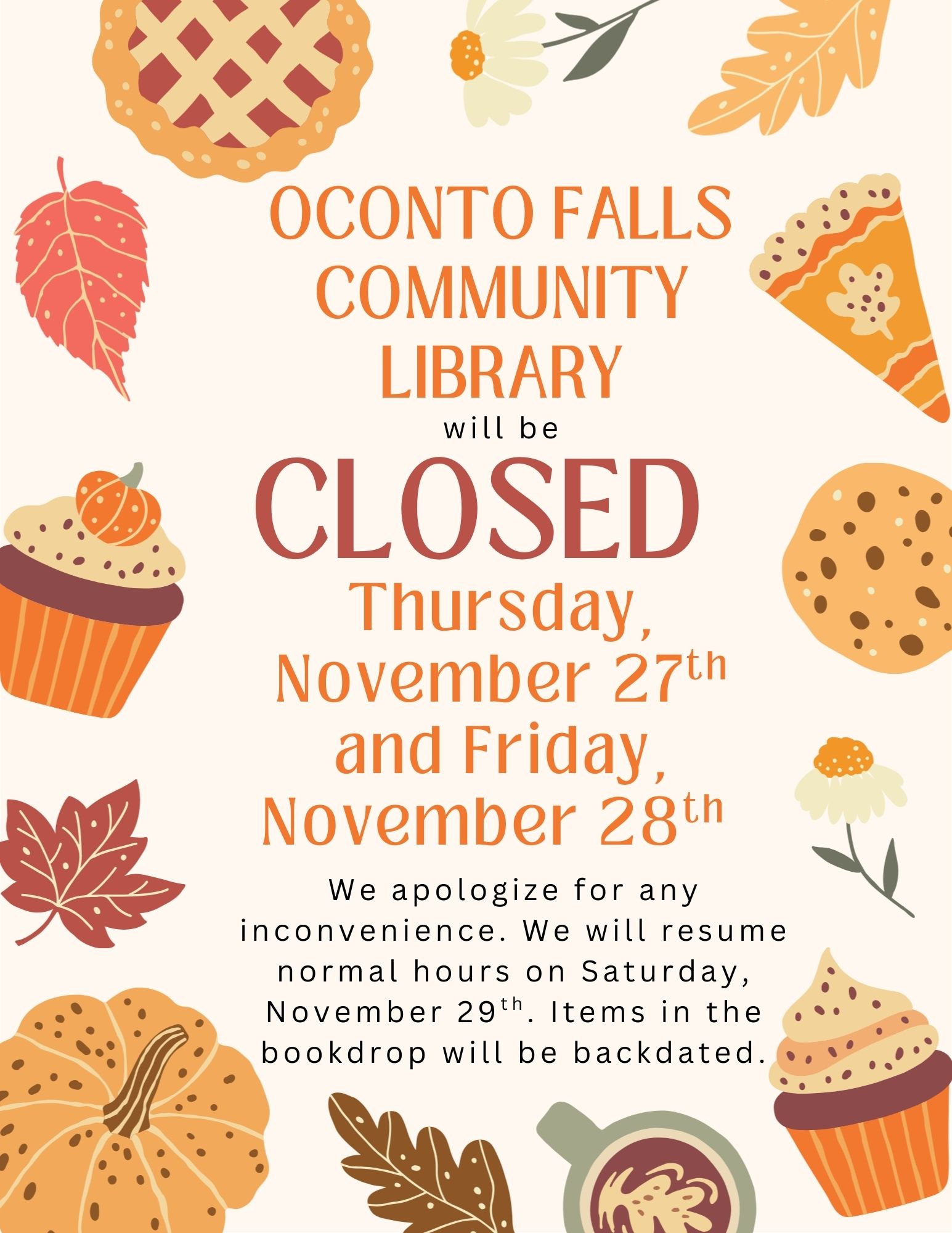 Oconto Falls Community Library will be CLOSED on Thursday, November 27th and Friday, November 28th.